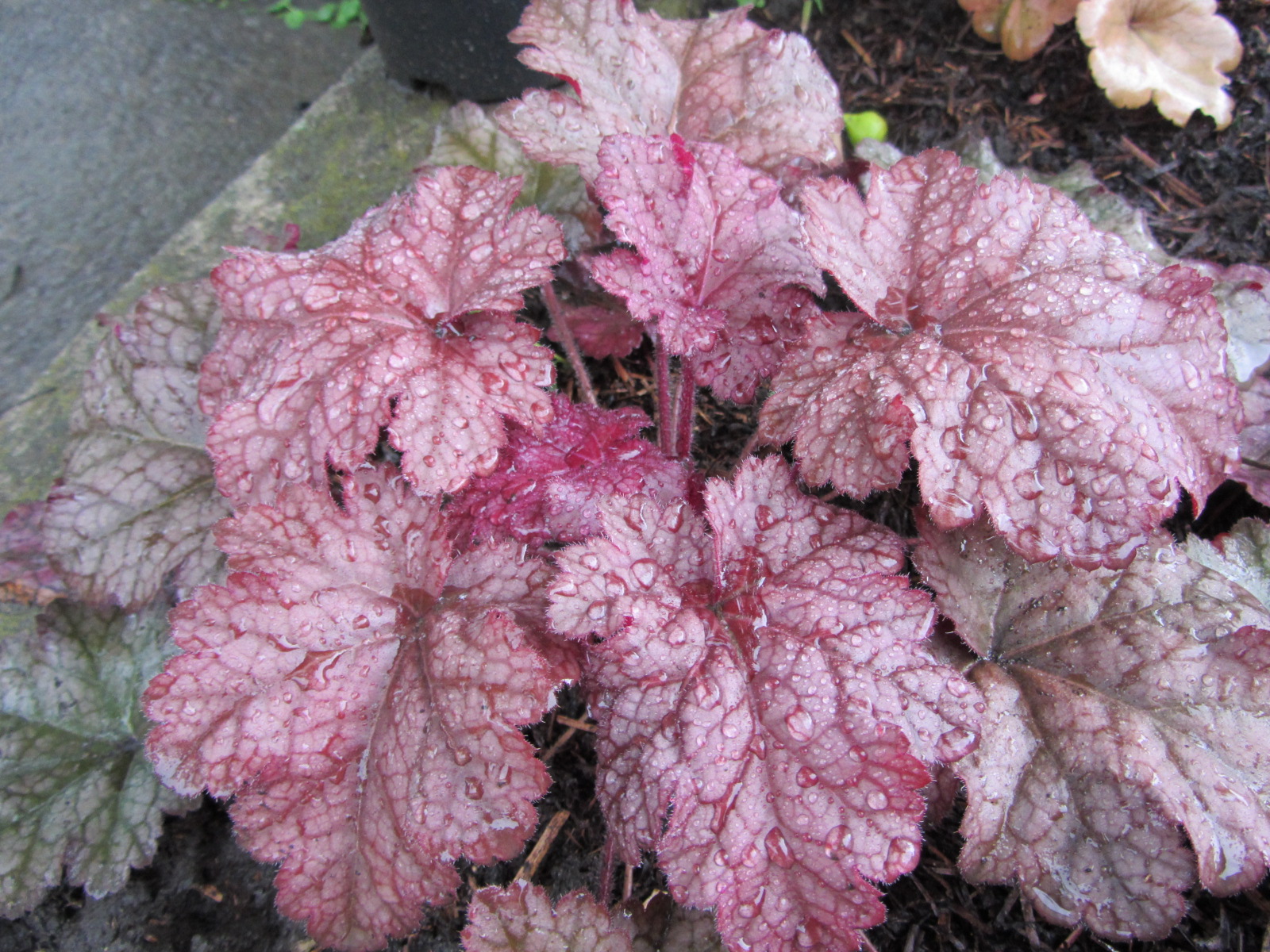 Гейхера SPARKLING BURGUNDY - зимостойкий куст высотой 30 см и диаметром 45 см. 15-сантиметровые бордовые листья буквально светятся всю весну и лето. Мультисезонный интерес начинается с весенней листвы цвета спелой вишни и белых цветов. Летом листья приобретают оливковые тона, а к концу сезона темнеют и становятся цвета богатого красного вина. Очень быстро растение формирует куст. Предпочитает солнце и полутень. Цветки белые, появляются в июне.