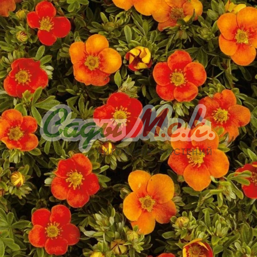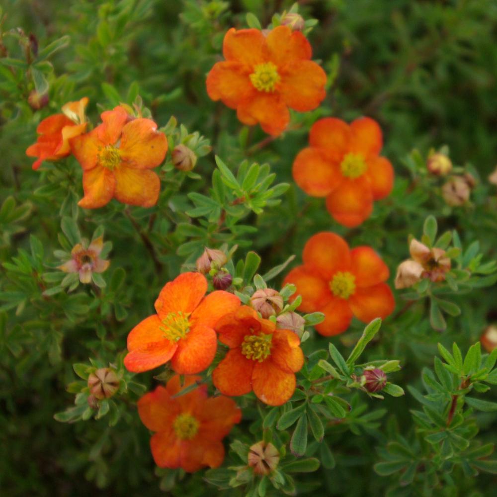 Лапчатка кустарниковая Белла Сол (Potentilla fruticosa Bella Sol). густой, компактный кустарник. Цветки полумахровые, яркие, насыщенно-оранжевые, не выгорают. Листья сначала нежно-зеленые, затем зеленые с серебристым оттенком. Зимостойкая.