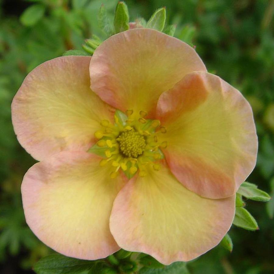 Корни лапчатки кустарниковой Day Dawn вырастают в невысокий, до 1 метра, густой и разветвлённый кустарник. Ярко-зелёная листва состоит из мелких, сложных листьев округлой формы, часто со светлой каймой. Благодаря оригинальной форме мелких листьев и разветвлённости куста лапчатка Day Dawn очень живописна. Крупные цветы имеют нежную лососевую или персиковую окраску, и радуют глаз с июня, вплоть до сентября.