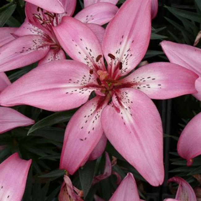 Луковицы азиатской лилии Хэппи Кисс (Lilium asiatic Happy Kiss) относятся к низкорослым сортам, которые можно выращивать как в открытом грунте, так и в контейнерах. Стебли прочные, темно-зеленые, высотой до 40 см. Цветки крупные, около 15 см в диаметре. Окраска пастельно-розовая, с расходящимися от центра белыми мазками. От горла отходят темно-розовые линии. Дополнительно разбросан бордовый крап. Лилия предпочитает защищенные от ветра солнечные участки или полутень. Лилия азиатская Хэппи Кисс любит умеренный полив, но без чрезмерного переувлажнения. Почвы лучше выбирать плодородные, рыхлые, дренированные.