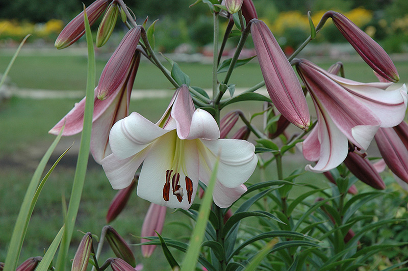 Лилия Easter morn - изумительный гибрид высотой более 90 см. Цветки белые, трубчатые, огромные. По краю лепестков бывает заметна малиновая каемочка. С внешней стороны лепестки темно малиново-пурпурные; когда у этой лилии открыто 12-15 бутонов.