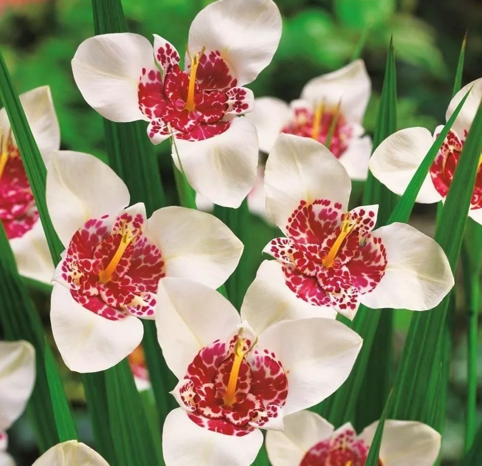 Луковицы тигридии павлинья Вайт (White) поражают изысканным и трогательным цветением. Тонкие, но прочные цветоносы, высотой 50 сантиметров, несут на себе одиночные бутоны, состоящие из 3 крупных заостренных лепестков белой окраски. Центр цветка разукрашен ярко-малиновым крапом. Тигридию размещают группами, до 15 растений, высаживая к ним в компанию лилейники, гладиолусы, маки. Тигридия неприхотлива, но нуждается в выкопке на зиму и хранении луковиц в прохладном помещении. Многие цветоводы сажают Тигридию павлинью Вайт в контейнеры, получая возможность перемещать цветы по участку. Цветёт тигридия с июля по сентябрь.