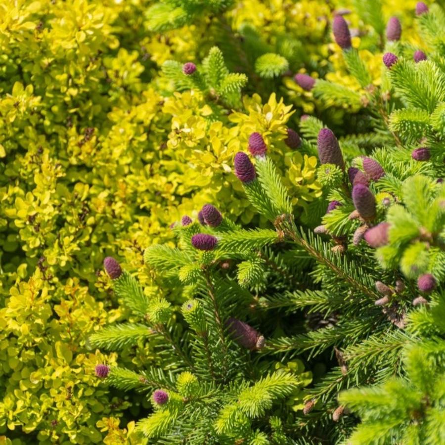 Ель обыкновенная «Акрокона Голден» - уникальный сорт с интересными декоративными характеристиками. Форма кроны ширококоническая, часто неправильная. Ветви густые, раскидистые, с поникающими концами. Растет медленно, к 10 годам едва достигает 1 м, а в зрелом возрасте при высоте около 2 м диаметр кроны составляет более 2-3 м. Хвоя зеленая, густая, расположена под острым углом к побегу. Молодые приросты сочного светло-зеленого цвета. Яркий отличительный признак ели «Акрокона Голден» - малиновые шишки, образующиеся на концах побегов даже у молодых деревьев.
