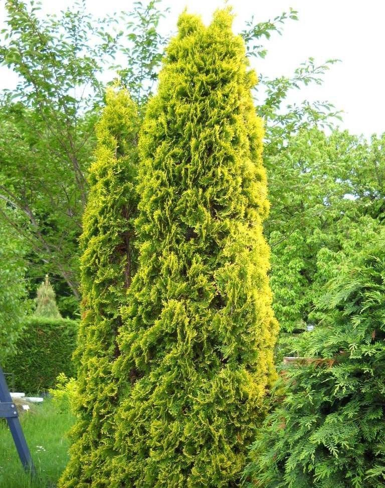 Узкая острая желто-хвойная туя высотой до 10 м. и диаметром кроны до 1,8 м. Дерево растет довольно быстро, ежегодно прибавляя до 30 см высоты. Имеет прямой, ровный и стройный ствол, к которому плотно прижимаются скелетные ветви, образуя красивую устремленную вверх общую форму дерева.Скелетные ветки короткие и мощные, тесно прижимаются друг к другу, а на концах начинают сильно ветвиться. За счет такого строение крона выглядит очень густой и плотной, формируется симметрично. Хвоя густая, яркая, золотисто-жёлтая, не подгорает на солнце, зимой приобретает бронзовый оттенок. Хорошо себя чувствует как на солнце, так и в полутени. На солнце не горит.<br>