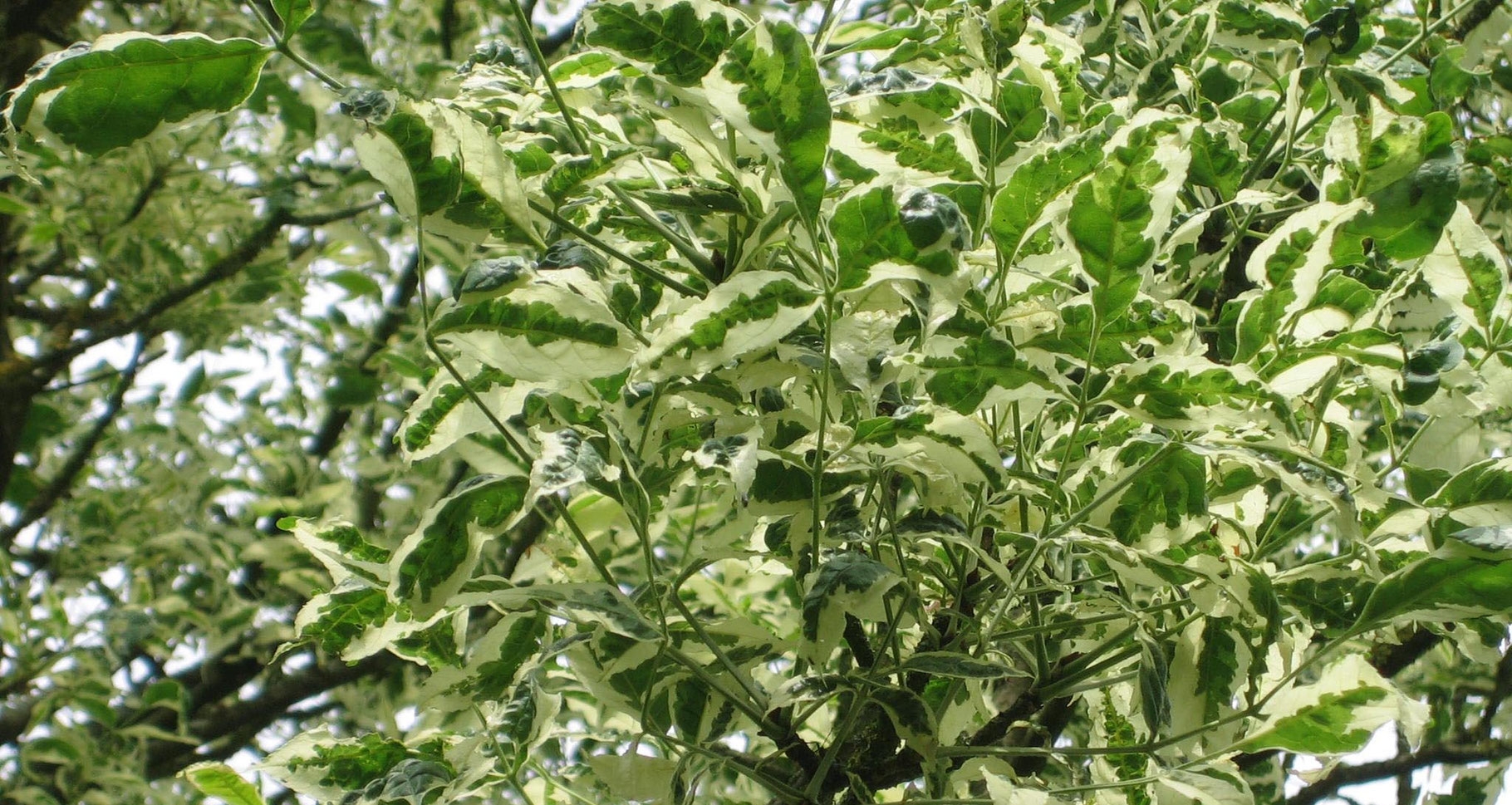 Дерево высотой до 15–20 м с ажурной кроной и белоокаймлёнными листьями, благодаря чему растение издалека выглядит белым. Возможно обгорание листвы в условиях перегрева. Очень светолюбив, в тени интенсивность окраски теряется