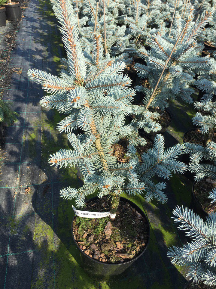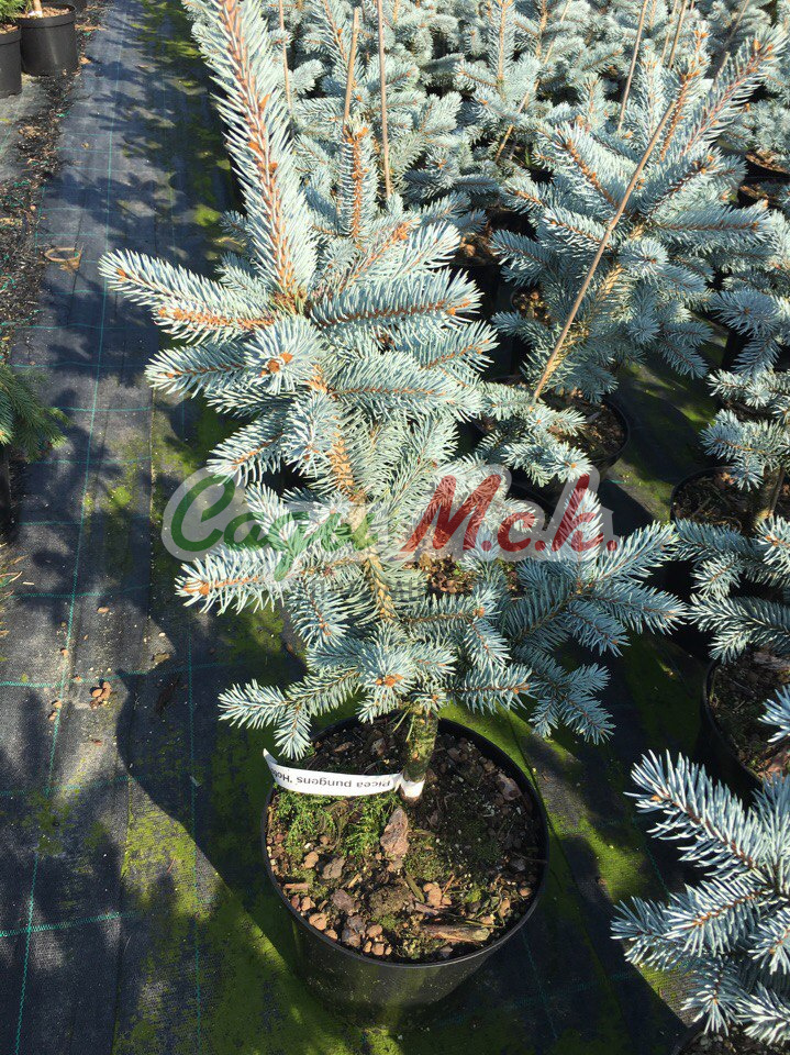 Дерево высокорослое, достигает 15 м в высоту и около 8 м в ширину. Обладает ионизирующими воздух свойствами. Ежегодный прирост составляет 15 см в ширину и до 30 см в высоту. Крупномер колючая Glauca покрыт серебристо-голубой, жесткой хвоей (около 2,5 см). Ель ценится благодаря необычной окраске и красивой форме кроны. Может использоваться в одиночных посадках, для формирования живой изгороди. Саженцы светолюбивы, морозостойкие, не требовательны к почве, но любят обильный полив.
