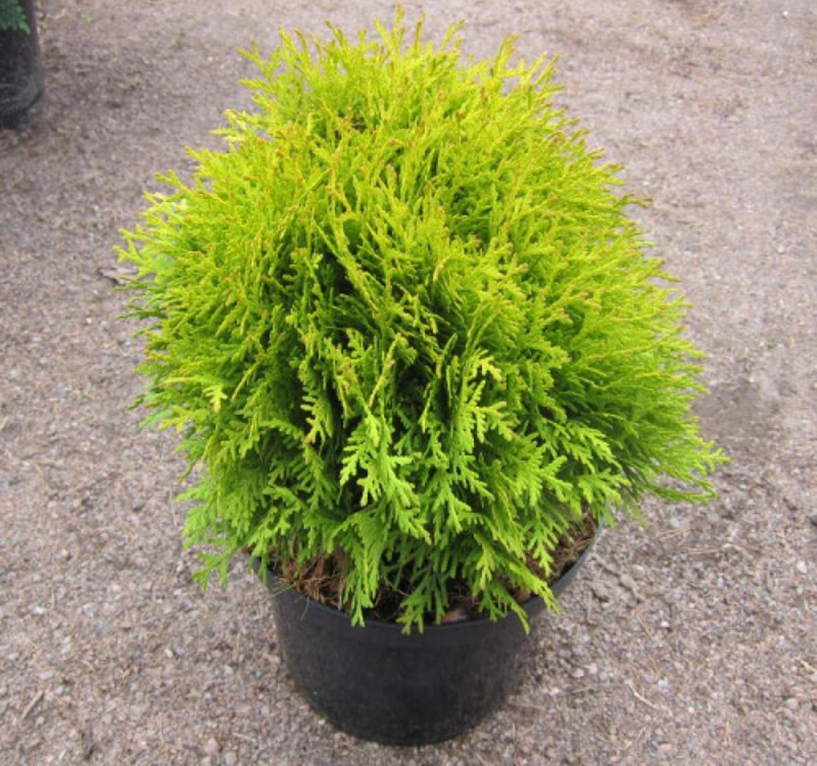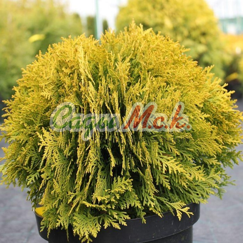 Туя западная Мириам - вечнозеленый хвойный кустарник. Форма кроны плотная, шаровидная. Медленнорастущая форма, высота и ширина до 80 см. Хвоя чешуйчатая, золотисто-желтая, густая, зимой приобретает оранжевый оттенок. Корневая система поверхностная, чувствительна к уплотнению почвы.